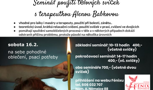 seminářem provede terapeutka Alena Babková / od 10.00 do 13.00 hodin základní seminář (kurzovné 400 Kč, včetně jedné svíčky), od 14.00 do 17.00 pokračující seminář (kurzovné 400 Kč včetně jedné svíčky) - za oba semináře dohromady (700 Kč) Tělové svíce...
