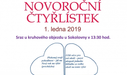 Novoroční čtyřlístek, špacír kolem Zelené Hory (předpokládaná délka trasy 6 km), sraz u kruhového objezdu u Sokolovny Nepomuk v 13.30 hodin, pořádá KČT Nepomuk.