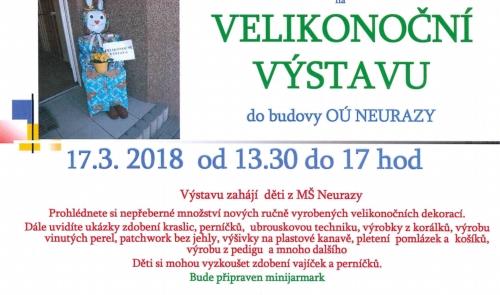 - vystoupení dětí z MŠ Neurazy - výstava rukodělných velikonočních dekorací, zdobení kraslic, perníčků, ukázky ubrouskové techniky, výroby vinutých perel, patchwork bez jehly, výšivky na plastové kanavě, pletení pomlázky a košíků, výroba z pedigu, výroba korálků...