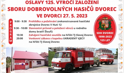 Pořádá SDH Dvorec k příležitosti 125 let založení sboru. Po skončení následuje taneční zábava na venkovním parketu, zahraje kapela Ukradený vjecy (20.00 hodin).