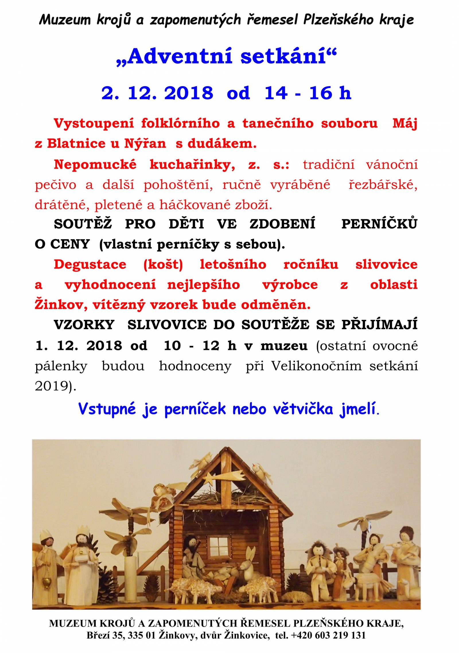 Muzeum krojů a zapomenutých řemesel Plzeňského kraje pořádá Adventní setkání s vystoupením folklórního a tanečního souboru Máj z Blatnice u Nýřan s dudákem. O vánoční pohoštění se postarají Nepomucké kuchařinky, z.s., které představí i své rukodělné výrobky.