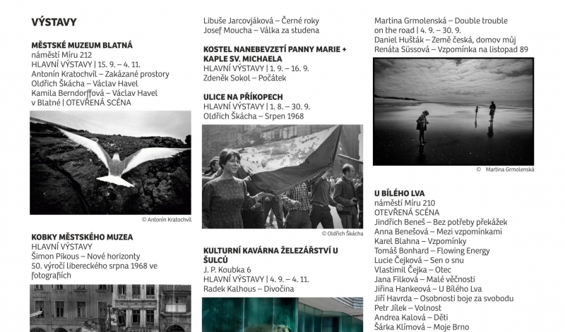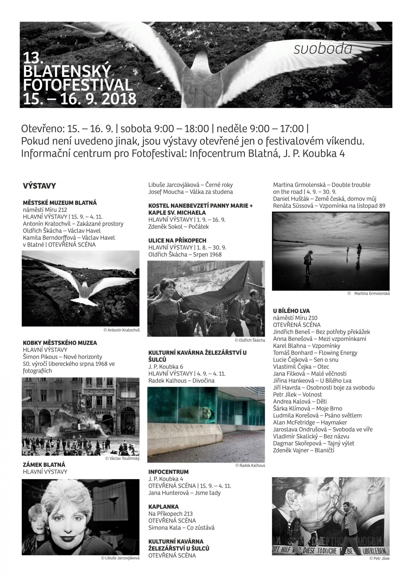 Letos proběhne již 13. ročník Blatenského fotofestivalu a ponese se jím symbolicky téma SVOBODY. Hlavní výstava BFF proběhne v Městském muzeu Blatná a bude pro návštěvníky otevřená 2 měsíce. Jedna část výstavy se bude konat ve spolupráci s Knihovnou Václava Havla a představí fotografie Oldřicha Škáchy, které zachycují život Václava Havla. Druhá část představí fotografickou tvorbu světoznámého fotografa Antonína Kratochvíla, který na Blatenský fotofestival zavítá také osobně.