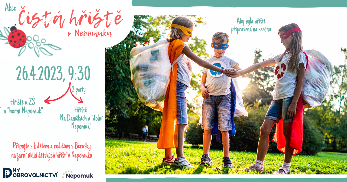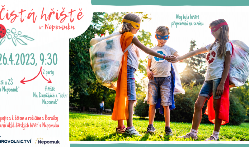 Připravme společně s nejmenšími dětská hříště v Nepomuku na letošní provoz a učme je od malička pečovat o prostředí, ve kterém žijí. Na velký jarní úklid před zahájením "venkovní" sezóny srdečně zveme každého, komu není lhostejné prostředí, ve kterém si naše děti hrají.