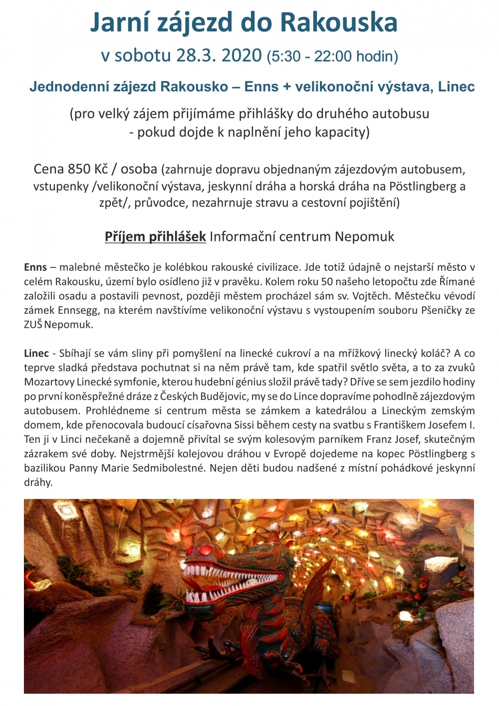 Cena 850 Kč / osoba (zahrnuje dopravu objednaným zájezdovým autobusem, vstupenky /velikonoční výstava, jeskynní dráha a horská dráha na Pöstlingberg a zpět/, průvodce, nezahrnuje stravu a cestovní pojištění)