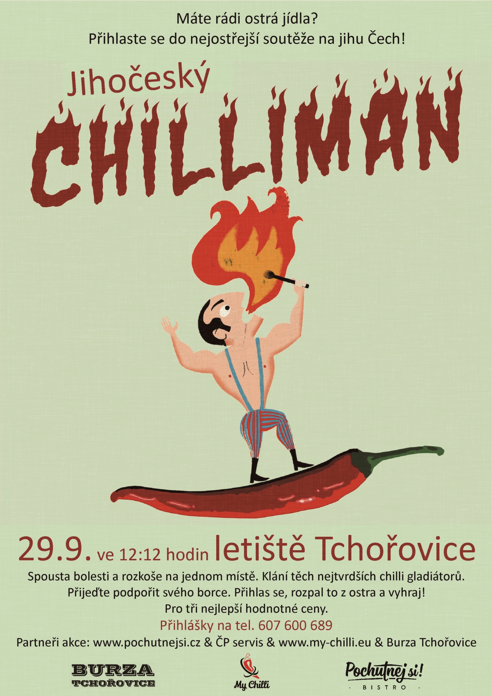 Přátelé ostrých jídel a nápojů, opět se ním blíží soutěž "JIHOČESKÝ CHILIMAN". Na tchořovickém letišti vypukne nejostřejší závod. GPS:49°25'52.49”N,13°47'58.59” Pokud se chcete zúčastnit,nebo znáte ve svém okolí milovníka ostrého, neváhejte se přihlásit na telefonu: 607600689.Nebo na: jihoceskychilliman@centrum.cz