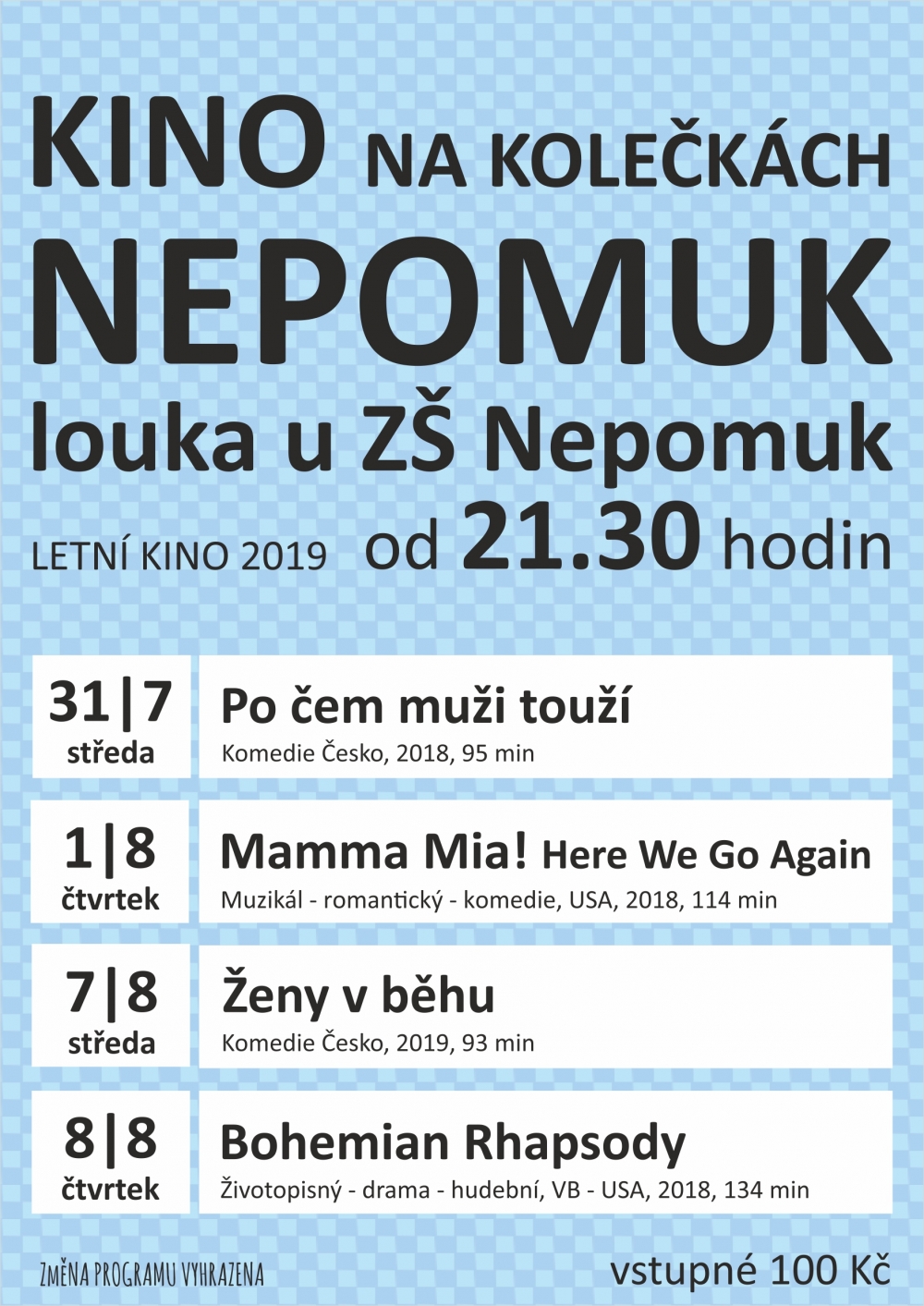 Promítat bude v Nepomuku na hřišti u školy. Program vybrali účastníci ankety na webových stránkách města: