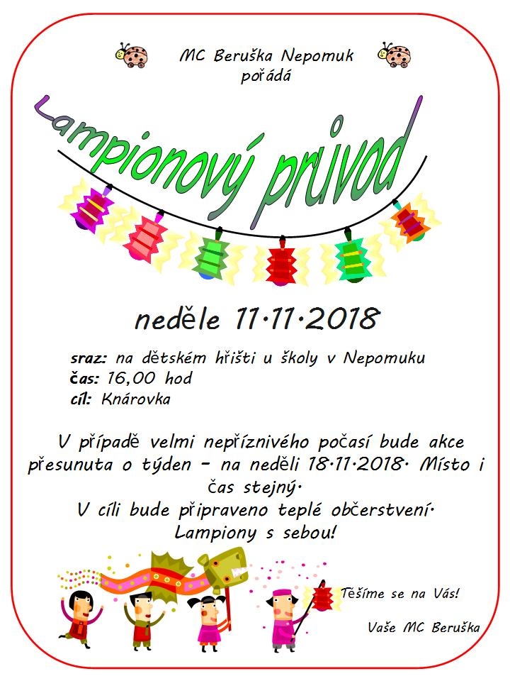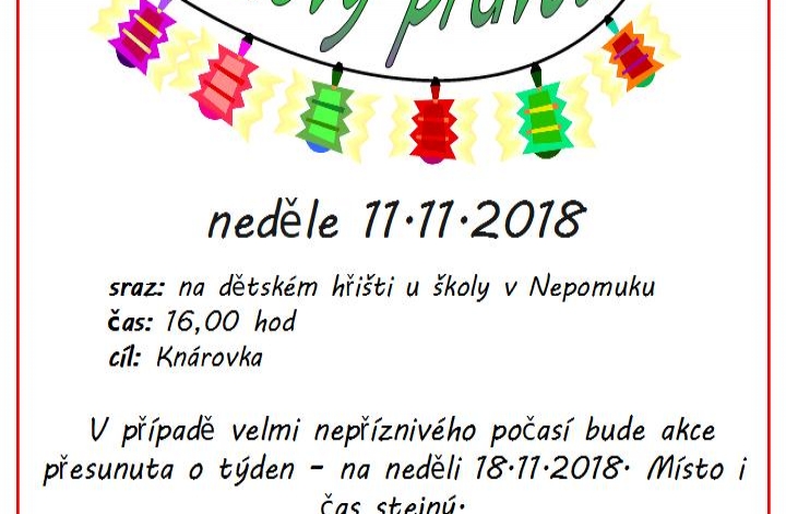 Startuje se ze hřiště u školy. Trasa povede na Knárovku, kde bude účastníky čekat teplé občerstvení. V případě nepříznivého počasí se akce posouvá na 18. 11. ve stejnou dobu na stejném místě. Pořádá MC Beruška.