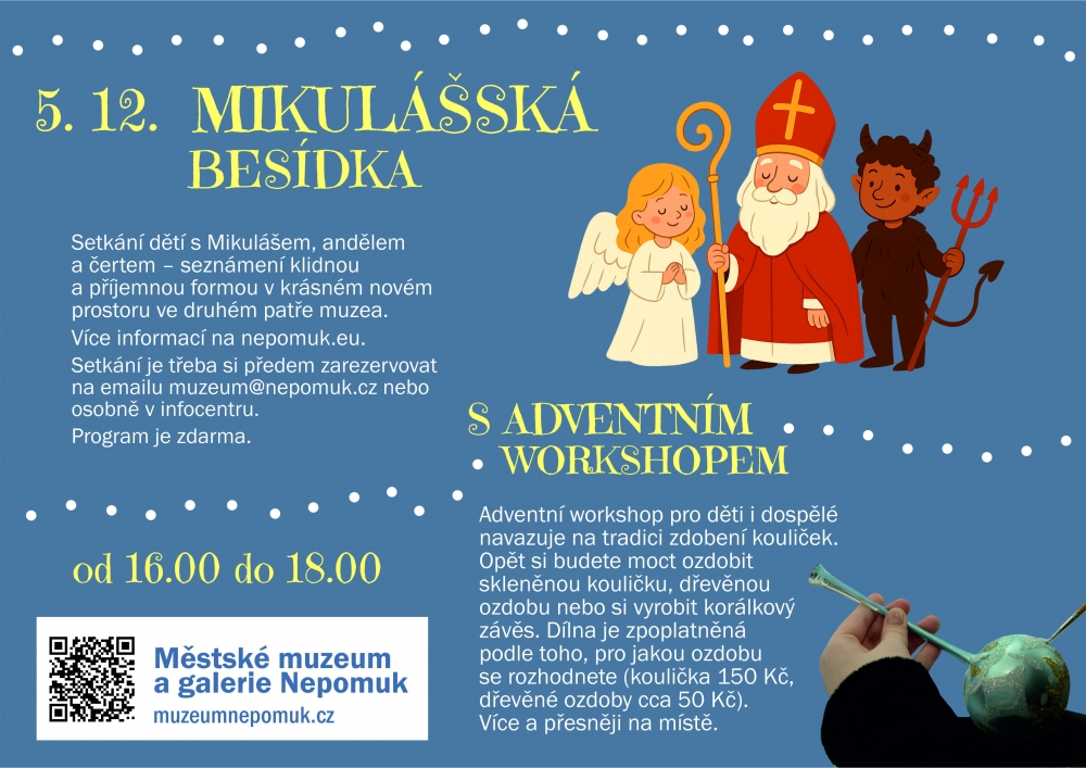 Mikulášská besídka pro děti – setkání s Mikulášem, andělem a čertem – seznámení v klidné a příjemné formě. Setkání chceme uspořádat tak, že Mikuláš a spol. budou na děti čekat v krásném novém prostoru v muzeu ve druhém patře. Při setkání se Mikuláš se zeptá na jméno dítěte a následně si v knize pravdy vyhledá jeho ctnosti a neřesti, které dítěti sdělí. Po vyslechnutí básničky nebo písničky od dítěte ho po té anděl odmění balíčkem, který je možné přinést do infocentra v týdnu před besídkou. Na besídku je třeba se předem zarezervovat – na email muzeum@nepomuk.cz, nebo osobně v infocentru. A u této příležitosti nám napsat, nebo přinést papír se jménem dítěte, jeho ctnostmi a neřestmi a balíček s odměnou – vždy opatřený jménem dítěte. Mikulášská besídka je zdarma, ale balíčky pro své děti musí rodiče donést.