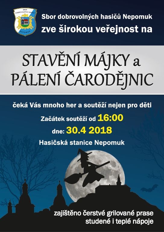 SDH Nepomuk připravilo bohatý program - soutěže pro děti, opékání vuřtů, pálení čarodějnice, živá hudba, grilované prase, občerstvení zajištěno