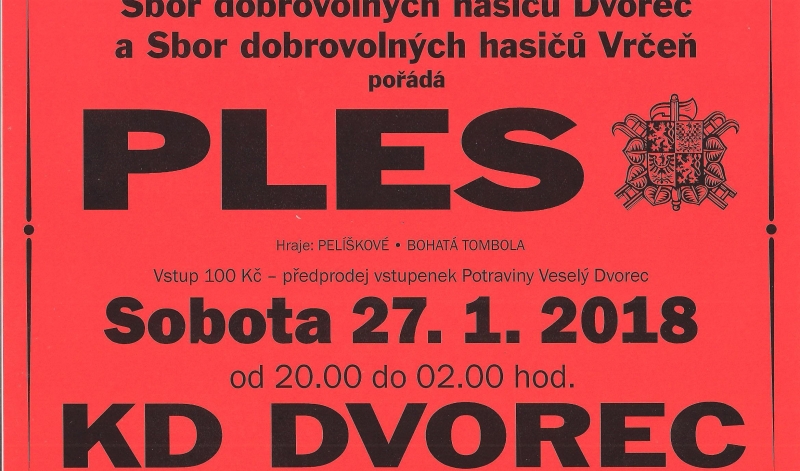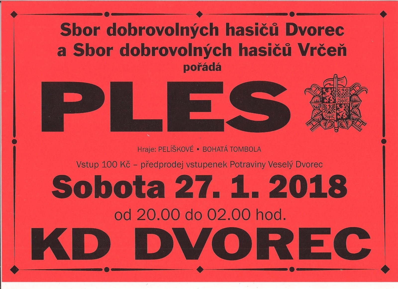 Ples SDH Dvorec a SDH Vrčeň, hrají Pelíškové, od 20.00 hod, Kulturní sál Dvorec, předprodej vstupenek Potraviny Veselý (Dvorec), vstupné 100 Kč.