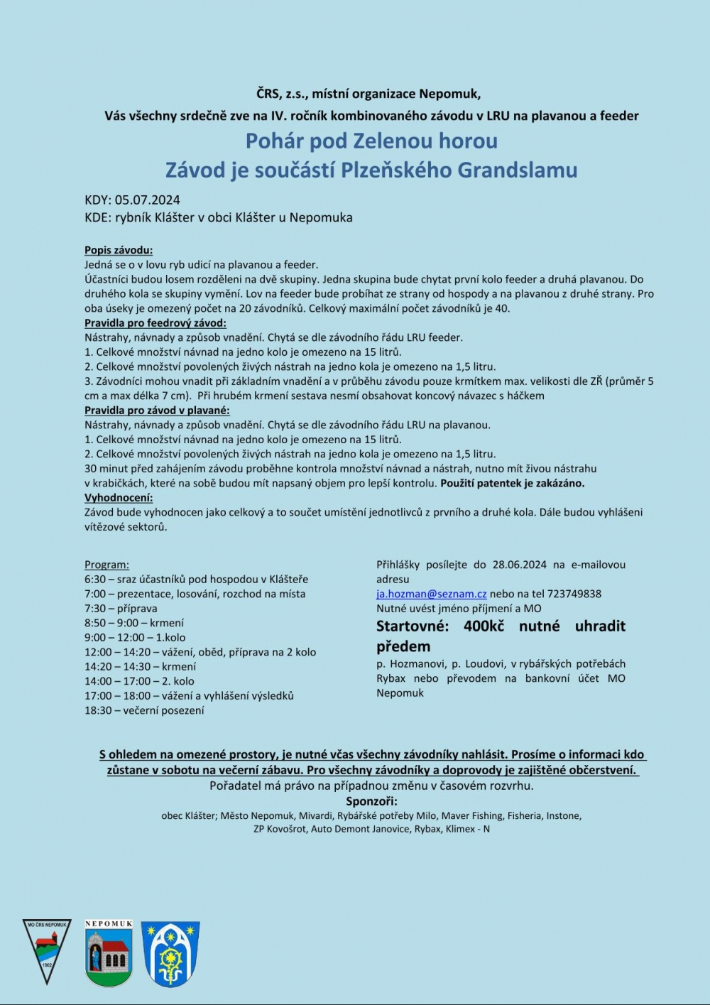 Startovné: 400 Kč nutné uhradit předem p. Hozmanovi, p. Loudovi, v rybářských potřebách Rybax nebo převodem na bankovní účet MO Nepomuk