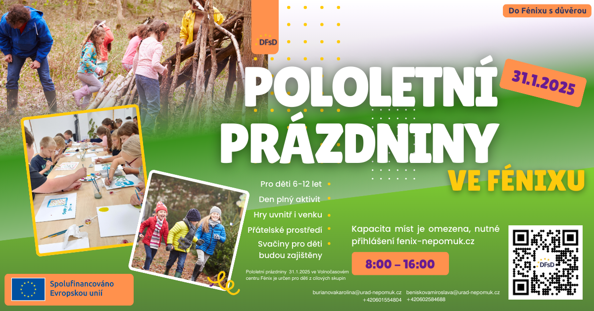 Pololetní prázdniny ve Volnočasovém centru Fénix jsou určeny pro rodiny, pro které je obtížné z různých důvodů zajistit dětem o pololetních prázdninách program, nebo dohled dospělé osoby. Jedná se např. o rodiče samoživitele, nebo ty, kteří si nemohou vzít na tento den ze závažných důvodů dovolenou, nebo náhle onemocněli a péče o dítě by byla v tento den nad jejich síly. Touto aktivitou město Nepomuk podporuje i pěstouny nebo děti, které mají specifické potřeby při výuce nebo problémy při začleňování do kolektivu.