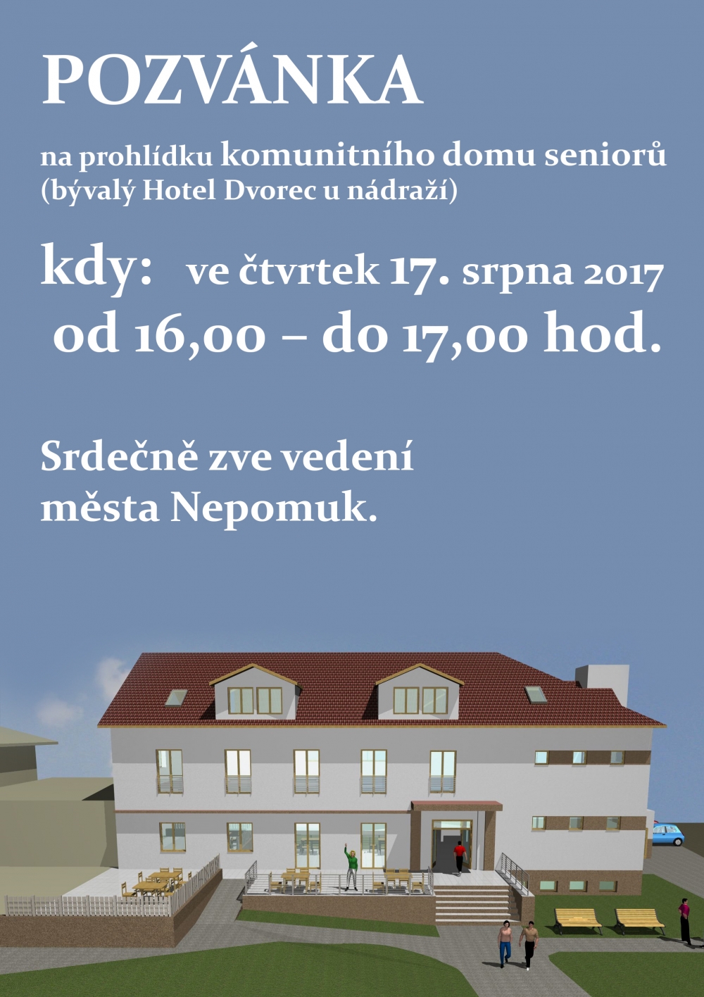 Pozvánka na prohlídku komunitního domu seniorů (bývalý Hotel Dvorec u nádraží)