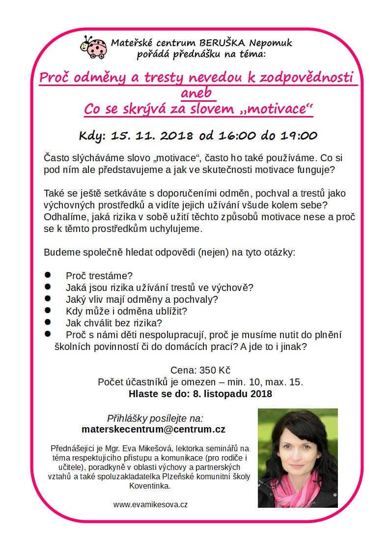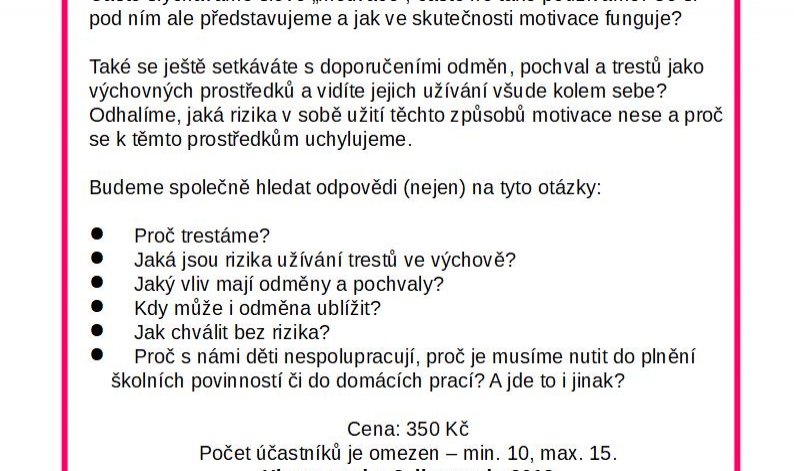 přednáška na téma "Proč odměny a tresty nevedou k zodpovědnosti, aneb co se skrývá za slovem motivace".