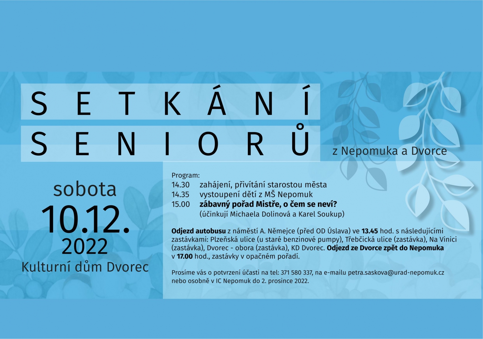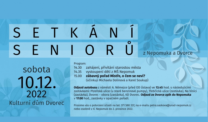 v letošním roce plánujeme, že se předvánoční setkání s vámi uskuteční v sobotu 10. prosince 2022 v Kulturním domě Dvorec od 14.30 hod. Abychom neohrozili Vaše zdraví, bude setkání probíhat stejným způsobem jako v loňském roce. Program zahájí starosta města Vladimír Vokurka, následovat bude vystoupení dětí z MŠ Nepomuk. Dále připravujeme zábavný pořad, v němž bude Karel Soukup zpovídat herečku a moderátorku Michaelu Dolinovou, která se s Vámi podělí o své zážitky a historky z hereckého prostředí. A abyste nebyli ochuzeni o občerstvení, darujeme každému z vás při odchodu balíček vánočního cukroví. Prosíme Vás proto o potvrzení Vaší účasti na tel: 371 580 337, nebo na e-mailu petra.saskova@urad-nepomuk.cz či osobně v IC Nepomuk do 30. listopadu 2022.