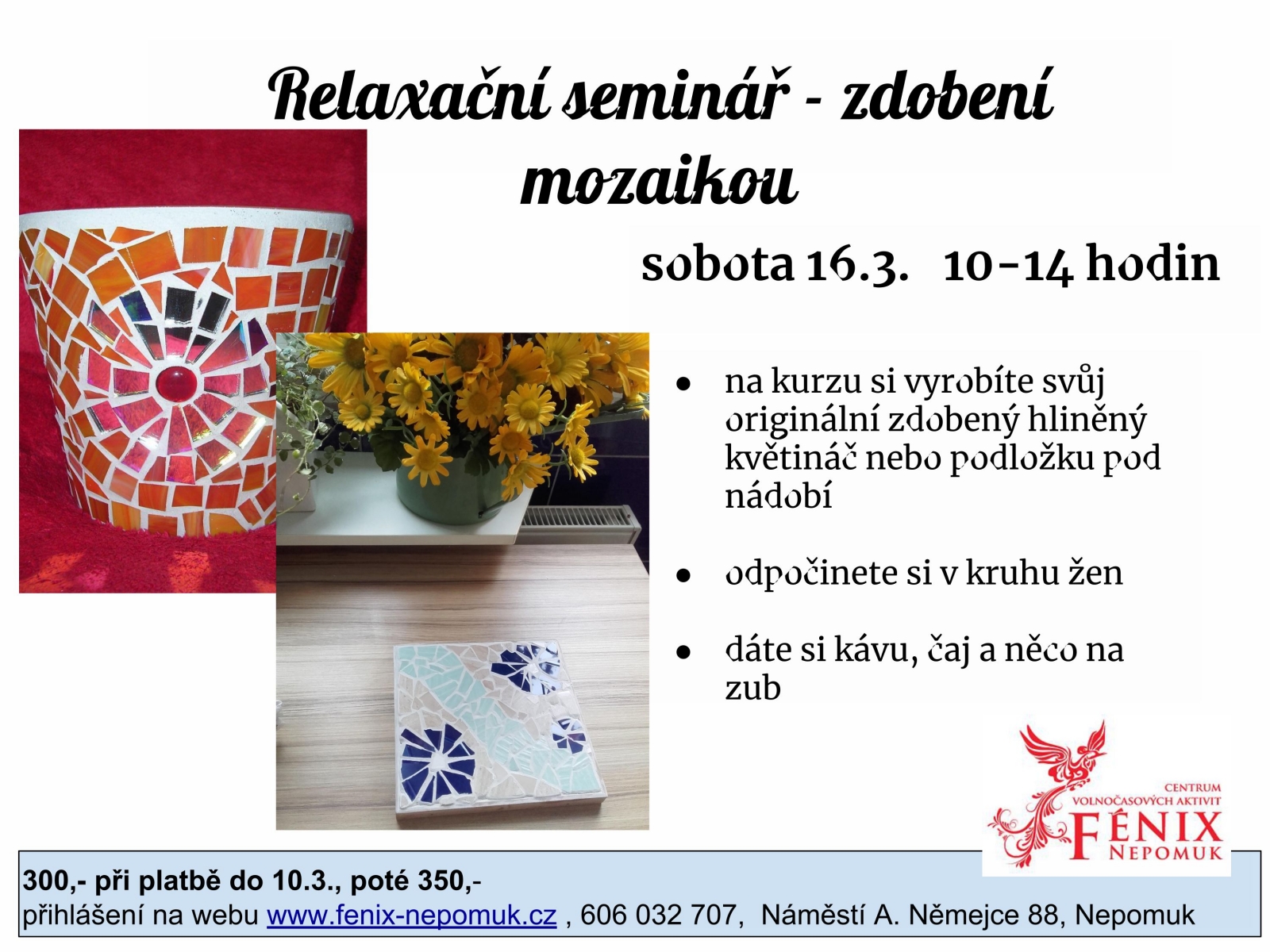 Přihlášky na webu fenix-nepomuk.cz nebo telefonicky.