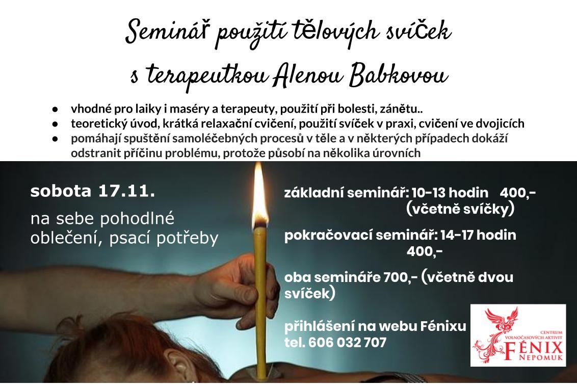 Seminář s terapeutkou Alenou Babkovou je vhodný i pro laiky, maséry i terapeuty. Čekají vás teoretický úvod, krátká relaxační cvičení, použití svíček v praxi a cvičení ve dvojicích.