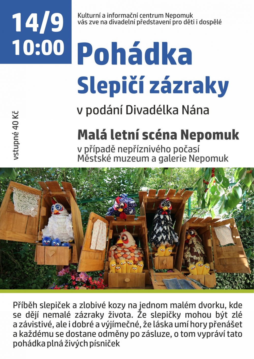 V případě nepříznivého počasí se bude pohádka hrát v Městském muzeu a galerie, která je hned vedle Malé letní scény na náměstí A. Němejce 126.