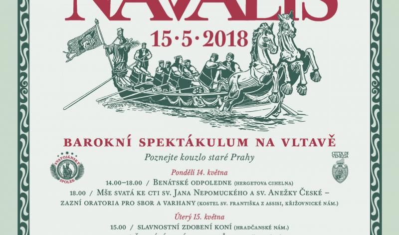 Stejně jako v letech předešlých, tak i v tomto roce Vás zveme na další ročník Svatojánských slavností NAVALIS. Letos oslavíme první jubilejní desáté výročí, kdy se v novodobé historii uskuteční v Praze obnovené vodní barokní Svatojánské slavnosti NAVALIS. Slavnosti oslavují nejznámějšího českého světce Jana Nepomuckého, patrona zpovědního tajemství, dobré pověsti, města Benátek v Itálii a všech lidí od vody. Slavnosti se konají 14. - 15. května a hlavními protagonisty budou benátští gondoliéři se svými nádhernými loděmi. Návštěvníci mají jedinečnou příležitost vidět nejen klasické italské gondoly, ale i tzv. Bissone - loďě, které se účastní těch nejzdobnějších tradičních benátských slavností včetně benátského karnevalu. Návštěvníci NAVALIS budou mít možnost jako první na celém světě vidět tyto nádherné lodě mimo město Benátky, jelikož Bissone doposud nikdy neopustily domovskou benátskou loděnici a nepřekročily hranici města na laguně. Návštěvníci se dále mohou těšit např. na benátské odpoledne na Hergetově cihelně, další alegoricky zdobené lodě, slavnostní mši svatou v katedrále sv. Víta, Vojtěcha a Václava, svatojánské procesí jdoucí na Karlův most včetně Kunovického banderia, regatu lodí, seskok parašutistů nebo plavbu otužilců. Chybět nebude ani jedinečný hudební program z pera skladatele a držitele Českého lva Kryštofa Marka a velkolepý svatojánský ohňostroj na Vltavě.