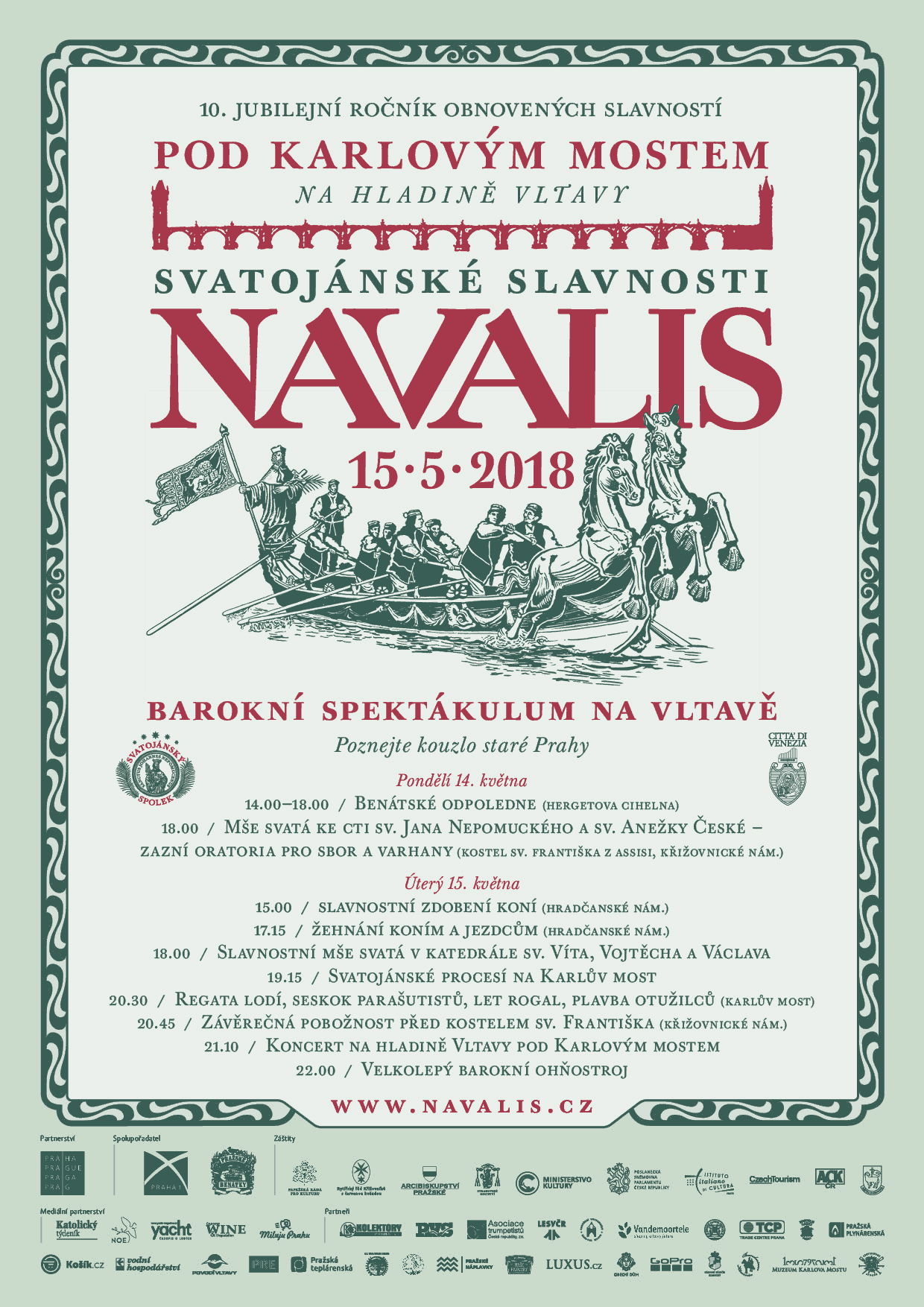 Stejně jako v letech předešlých, tak i v tomto roce Vás zveme na další ročník Svatojánských slavností NAVALIS. Letos oslavíme první jubilejní desáté výročí, kdy se v novodobé historii uskuteční v Praze obnovené vodní barokní Svatojánské slavnosti NAVALIS. Slavnosti oslavují nejznámějšího českého světce Jana Nepomuckého, patrona zpovědního tajemství, dobré pověsti, města Benátek v Itálii a všech lidí od vody. Slavnosti se konají 14. - 15. května a hlavními protagonisty budou benátští gondoliéři se svými nádhernými loděmi. Návštěvníci mají jedinečnou příležitost vidět nejen klasické italské gondoly, ale i tzv. Bissone - loďě, které se účastní těch nejzdobnějších tradičních benátských slavností včetně benátského karnevalu. Návštěvníci NAVALIS budou mít možnost jako první na celém světě vidět tyto nádherné lodě mimo město Benátky, jelikož Bissone doposud nikdy neopustily domovskou benátskou loděnici a nepřekročily hranici města na laguně. Návštěvníci se dále mohou těšit např. na benátské odpoledne na Hergetově cihelně, další alegoricky zdobené lodě, slavnostní mši svatou v katedrále sv. Víta, Vojtěcha a Václava, svatojánské procesí jdoucí na Karlův most včetně Kunovického banderia, regatu lodí, seskok parašutistů nebo plavbu otužilců. Chybět nebude ani jedinečný hudební program z pera skladatele a držitele Českého lva Kryštofa Marka a velkolepý svatojánský ohňostroj na Vltavě.