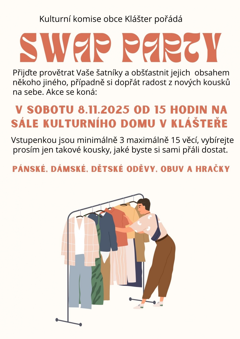 Zveme všechny zájemce na Swap party, kterou Kulturní komise obce Klášter pořádá v sobotu 8.11.25 od 15.hodin. Prosím přineste sebou minimálně tři, maximálně však patnáct kusů oblečení, obuvi nebo hraček. Odnést si můžete neomezené množství od všeho.