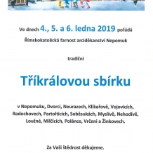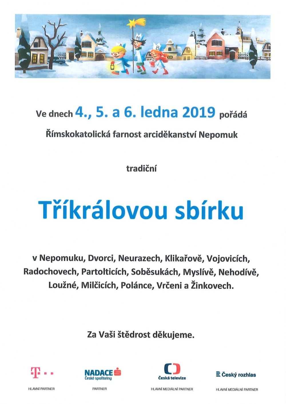 Tříkrálová sbírka v Nepomuku, Dvorci a okolí (Žinkovy, Vrčeň, Neurazy, Klikařov, Vojovice, Radochovy, Partoltice, Soběsuky, Myslív, Nehodív, Loužná, Milčice a Polánka), sbírku pořádá Římskokatolická farnost arciděkanství Nepomuk