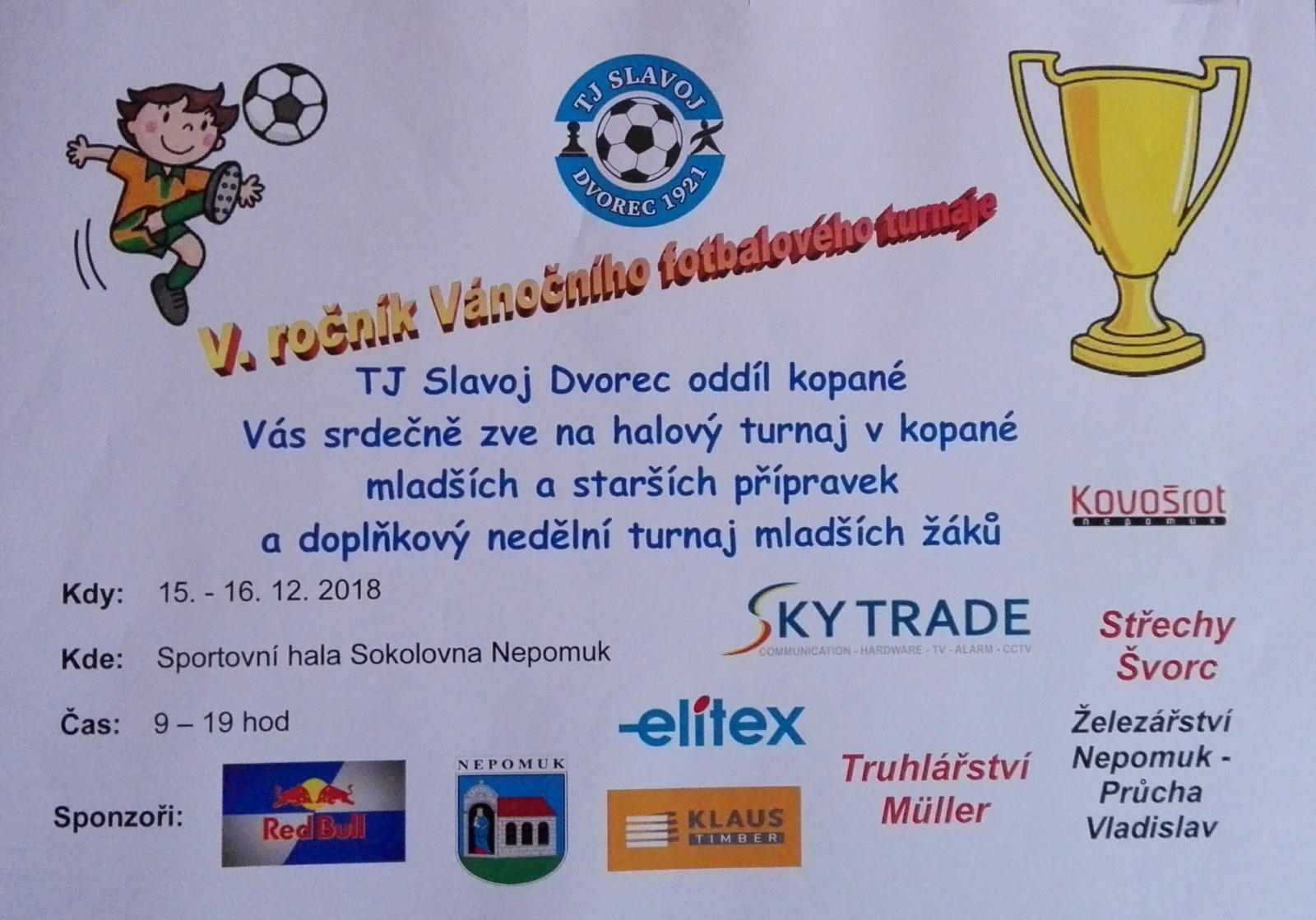V. ročník Vánočního fotbalového turnaje TJ Slavoj Dvorec - halový turnaj v kopané mladších a starších přípravek a doplňkový nedělní turnaj mladších žáků.