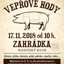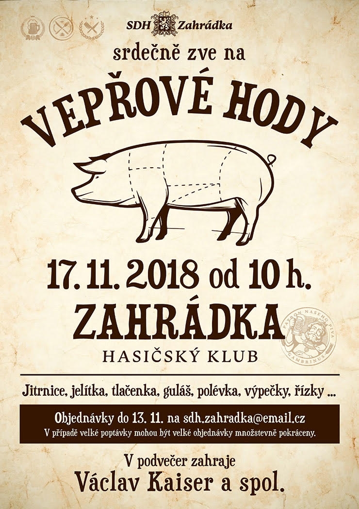 Sbor dobrovolných hasičů v Zahrádce srdečně zve na vepřové hody! Akce se uskuteční v sobotu 17. 11. v hasičském klubu. V podvečer zahraje Václav Kaiser a spol. Zabijačkové produkty si můžete objednat mailem na uvedené adrese do 13. listopadu.