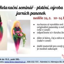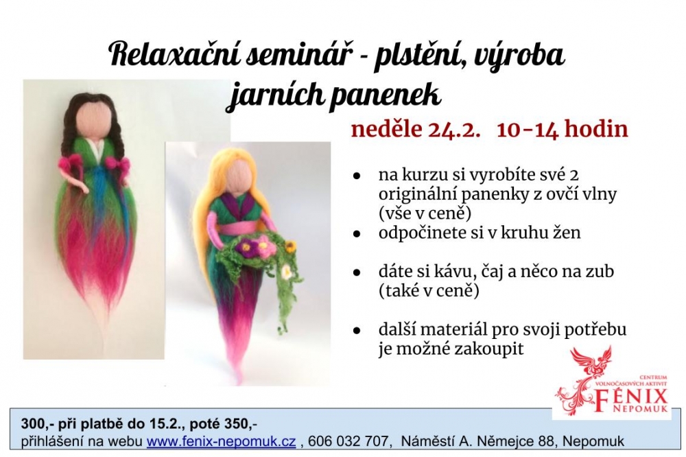 24. 2. Seminář plstění - výroba jarní panenky - kurz je vhodný pro začátečníky i všechny, kteří si chtějí přijít odpočinout u tvoření, od 10.00 do 14.00 hodin, pořádá Fénix, více na https://www.fenix-nepomuk.cz/?p=3981, kurzovné 300 Kč / 350 Kč, přihlášky na webu nebo na tel.: 606 032 707