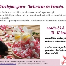 24. 3. Relax ve Fénixu – bude se cvičit jóga, relaxovat, povídat si o zdraví, učit se masážní techniky a mnoho dalšího (lektorky Alena Babková a Jana Makovičková), od 10.00 do 17.00 hodin, pořádá Fénix, kurzovné 850 Kč (vč. občerstvení), přihlášky předem, více na https://www.fenix-nepomuk.cz/?p=4103
