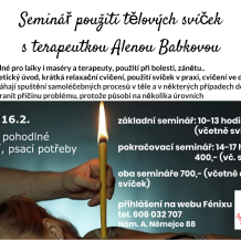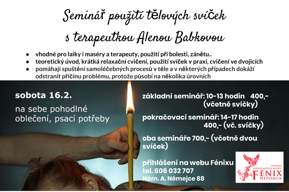 16. 2. Seminář použití tělových svící (terapeutka Alena Babková), od 10 do 13 hodin základní seminář (cena 400 Kč vč. jedné svíčky), od 14 do 17 pokračující seminář (400 Kč vč. jedné svíčky), za oba semináře 700 Kč, více na https://www.fenix-nepomuk.cz/events/seminar-pouziti-telovych-svicek-17-11
