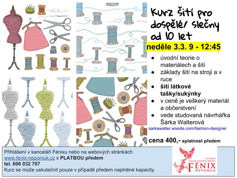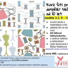 3. 3. Kurz šití pod vedením studované návrhářky Šárka Walterová, začátek práce na stroji, šití tašky (nebo vzorníků), od 9.00 do 12.45 hodin, pořádá Fénix, více na https://www.fenix-nepomuk.cz/?p=4131 , kurzovné 400 Kč (rezervace na webu)