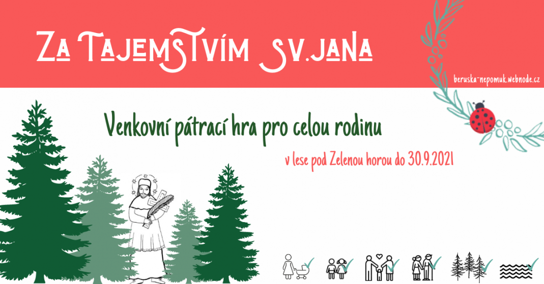 V rámci oslav blahořečení sv. Jana Nepomuckého MC Beruška připravila venkovní úkolovou hru pro celou rodinu v přírodě pod zámkem Zelená hora. Na zokruhované trase je připraveno 15 úkolů. Připraveny jsou 2 varianty - pro nejmenší děti i školáky.